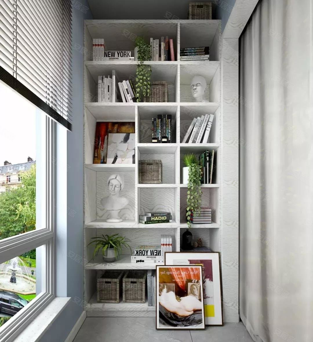 ▲一个通体的书柜,不仅可以收纳大量物品,更让阳台空间变得井然有序。书籍、石膏模型和绿植都可以进行陈列,美观实用。