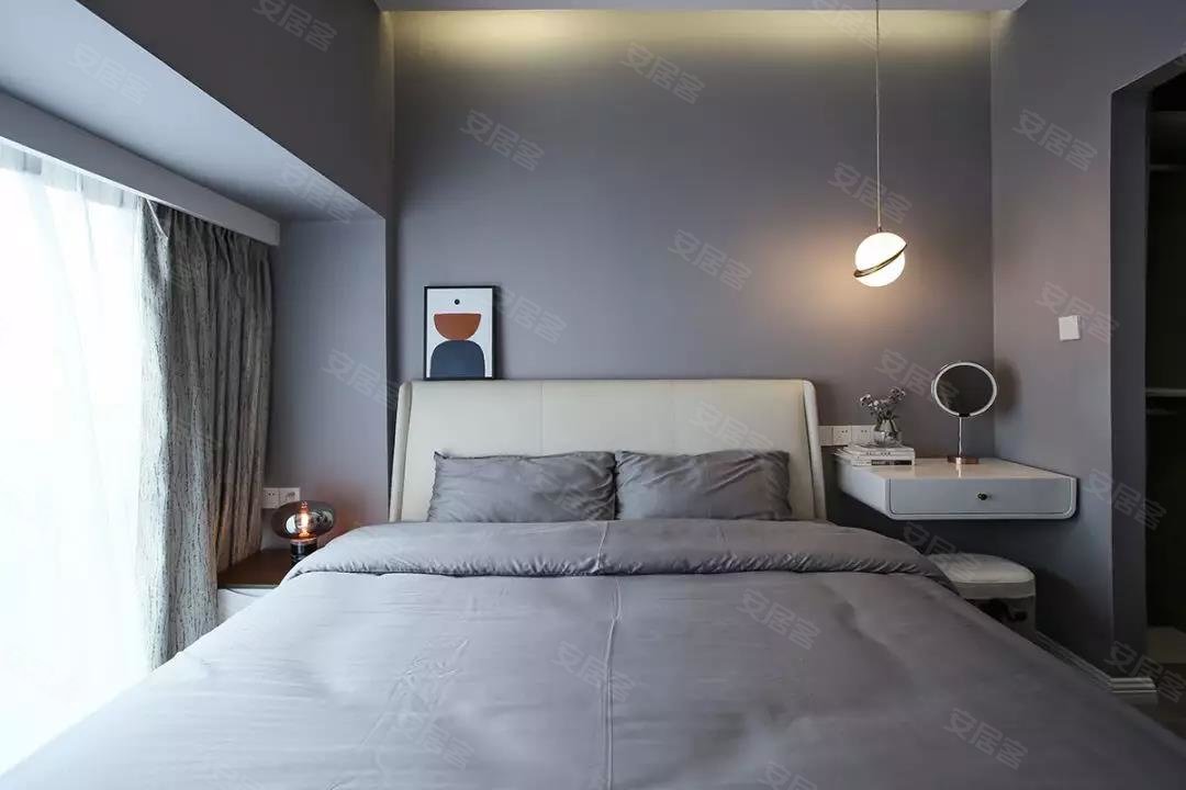 卧室选择了以蓝灰色为主,在卧室吊顶内加上藏光,用吊灯、台灯等代替主灯,让卧室看起来更为简洁。