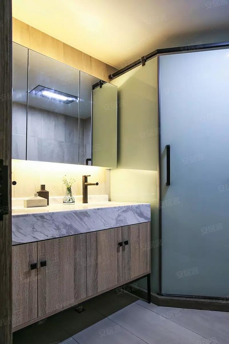 卫生间内部是三角形的布局,钻石形的淋浴房做在了转角处,两侧摆放洗手台和马桶。洗手台上方的镜柜做了藏光的设计,看起来更时尚~