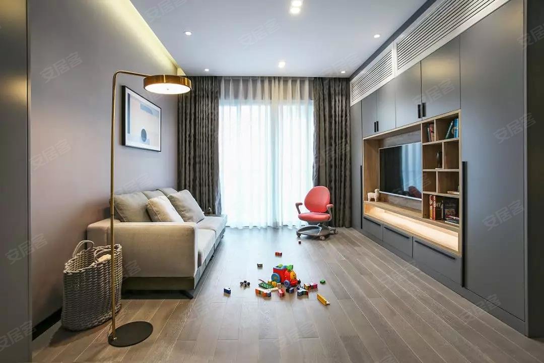位于餐厅另一侧的就是客厅空间了,客厅的茶几被舍弃,中间留空方便作为孩子的娱乐区,米色布艺沙发和暖灰色背景墙让人感觉更加温馨。