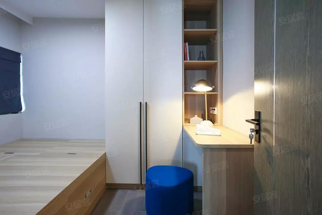 老人房选择了榻榻米床组合衣柜和书桌的设计,榻榻米的安全性会更高一些,加上一张书桌也方便屋主母亲看看书。