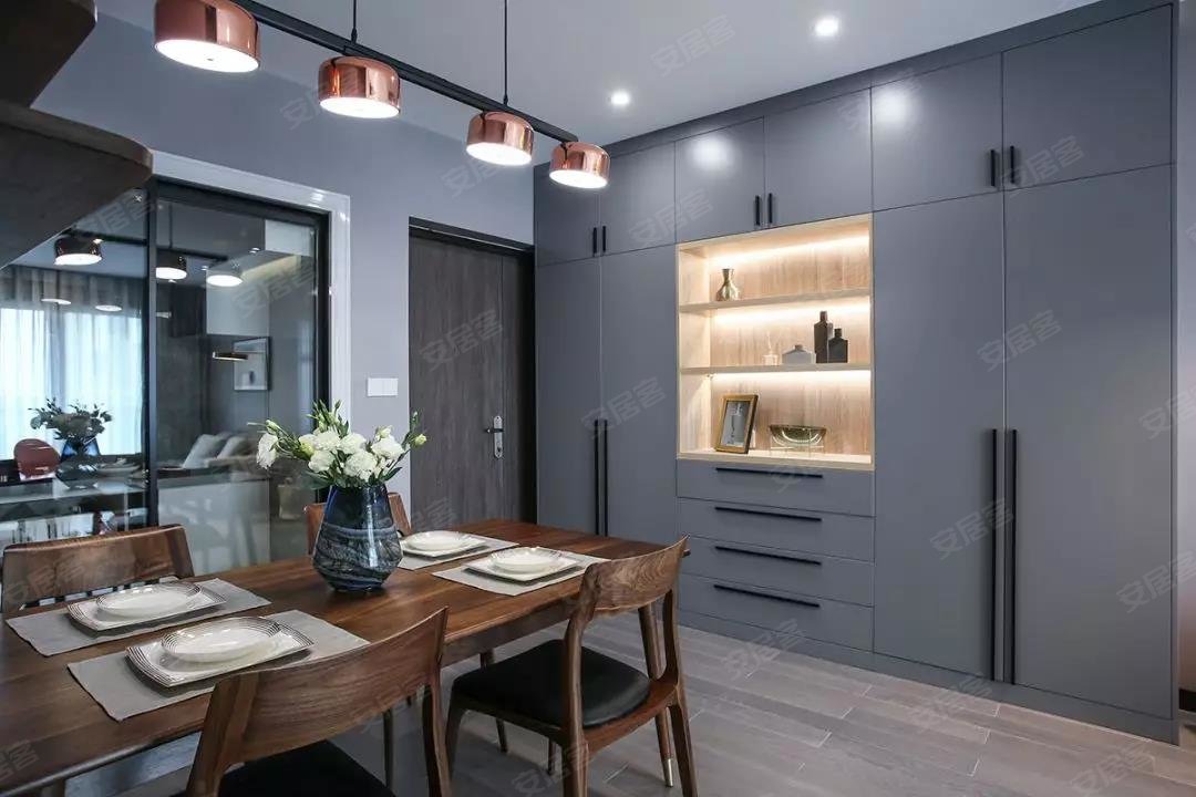 复古的木质餐桌椅到灰色调的背景,金属质感的吊灯,整个餐厅看起来非常有格调感。在餐桌椅侧方加上隔板的设计,增强储物能力