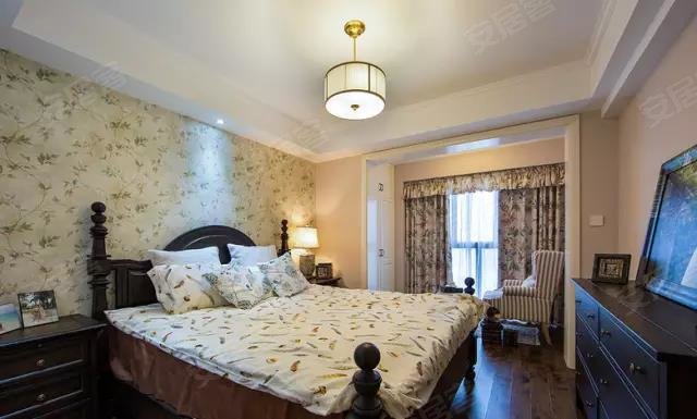 卧室的布置无论从家具还是墙纸,都与客厅相呼应,带有围栏的床具搭配碎花的床品,美式风情更为动人。