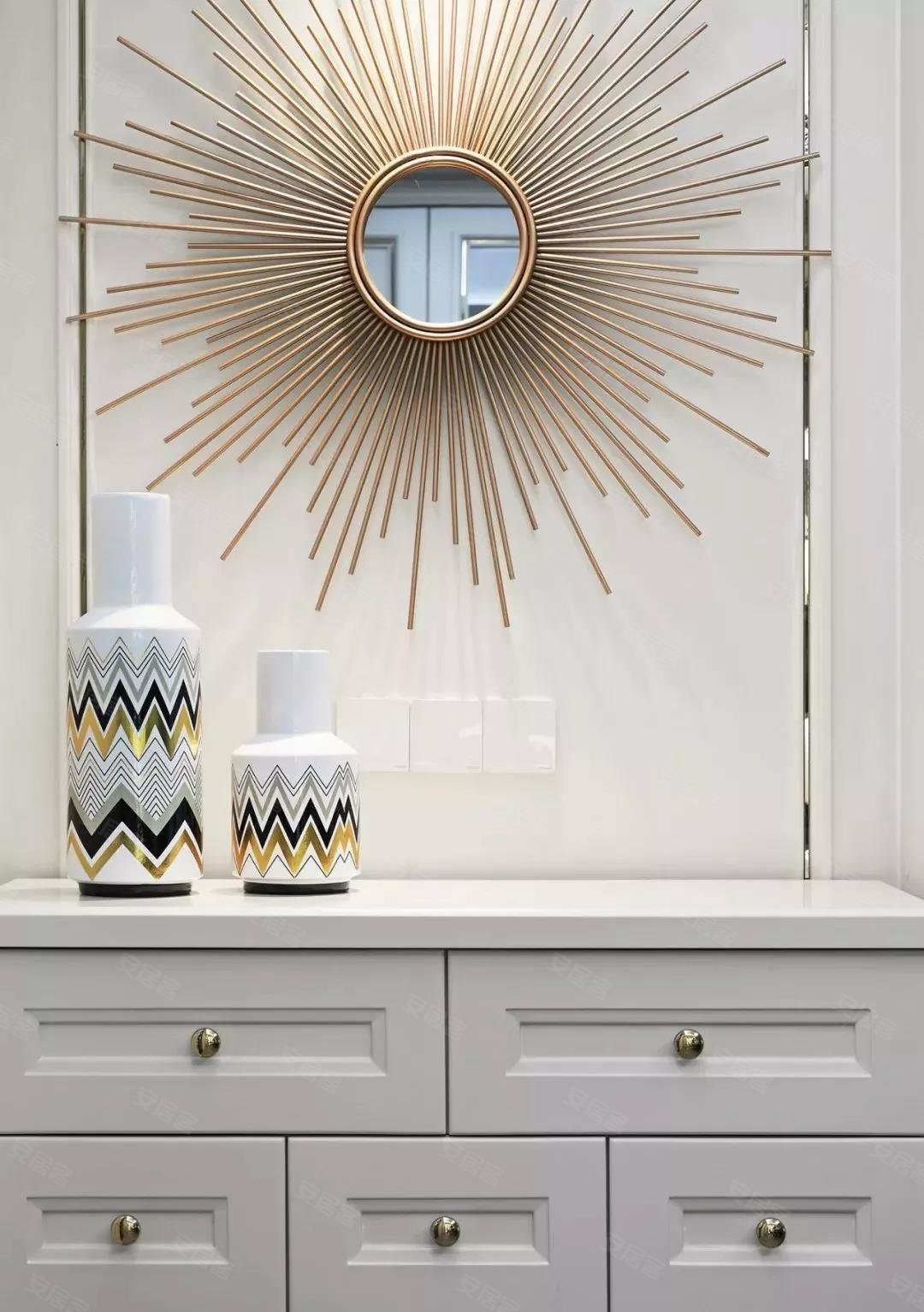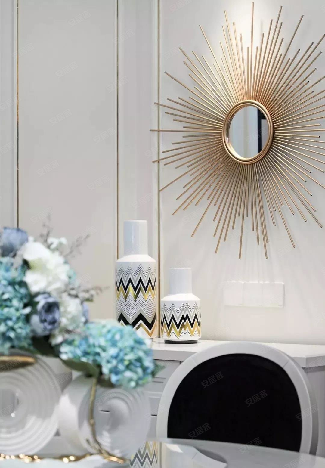 墙面切片划分,最有意思的是储物柜上的瓷瓶摆件和镜面挂件,瓷瓶的图案和颜色与镜面延展出的线条相结合,有种孔雀展屏之感,确有倾城之美。