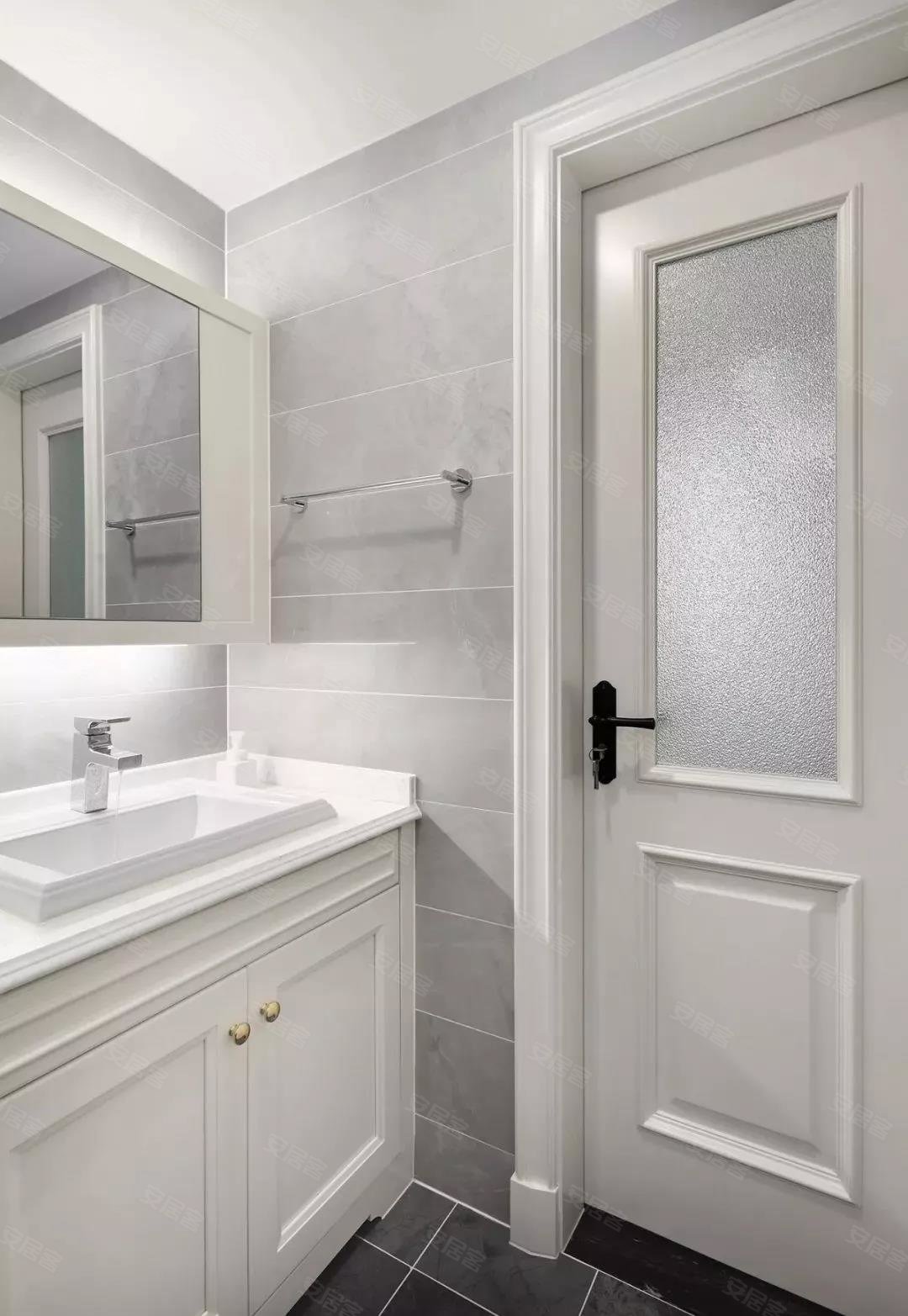 主卫磨砂玻璃保证了私密性,吊柜节约空间,台下盆易于清洗及使用,防止溅水溢水,灰色地砖耐脏,便于打理,兼顾实用性。