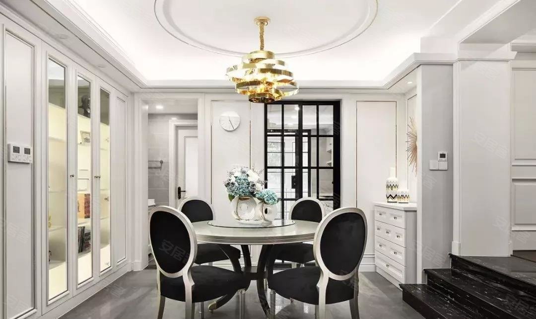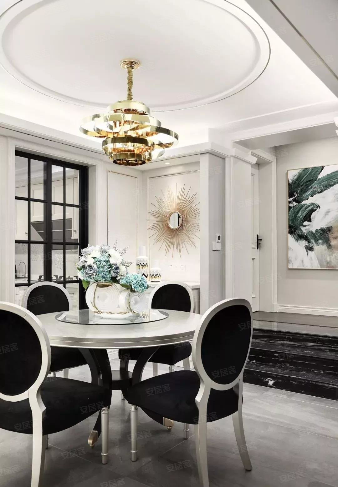 餐厅做了简单的圆形吊顶,搭配弧形流线的吊灯,一张小小的圆桌,四把座椅,这样的就餐环境,接近家人之间距离,同时也不失仪式感。