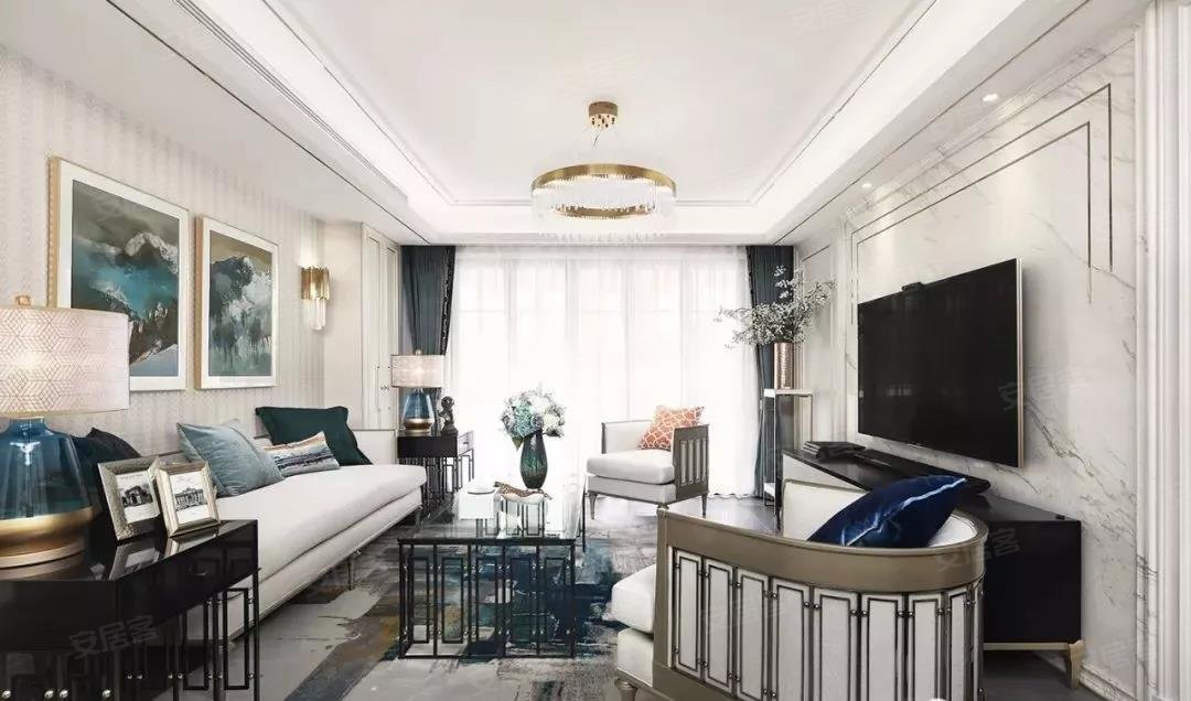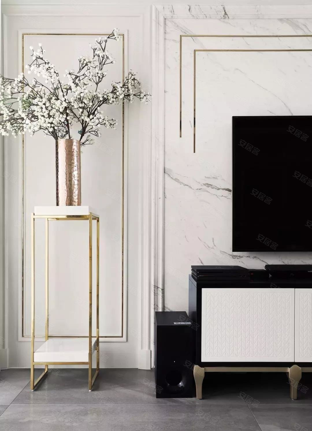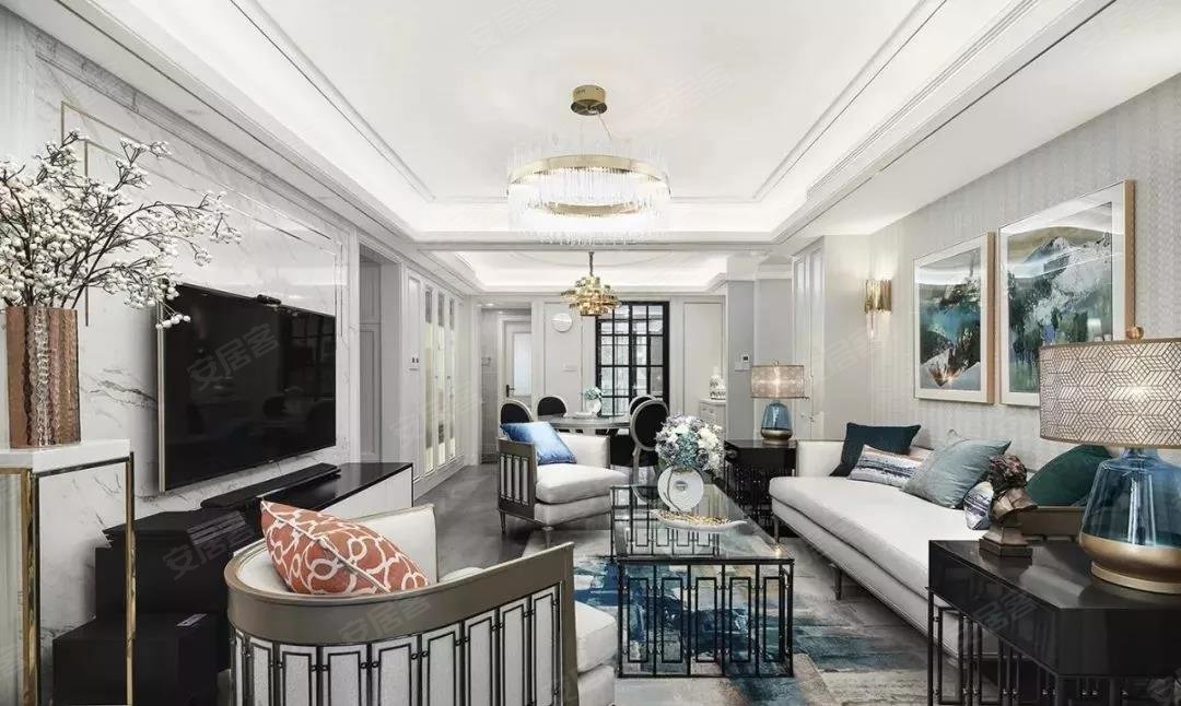设计师通过对装修材料的精选,客厅爵士白大理石背景墙、水晶玻璃灯、美克美家家具等,营造出一种精致有品的轻奢家居环境。