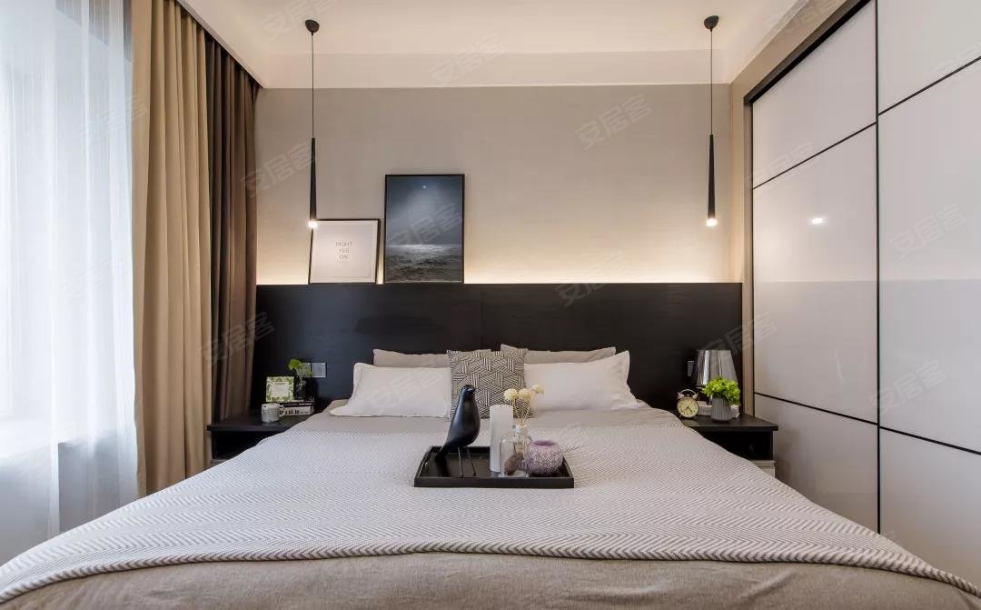 主卧室的床头柜和床头靠背结合在了一起,在后方还加上了藏光的设计,以暖灰色和白色、黑色搭配起来,看起来就很有档次。