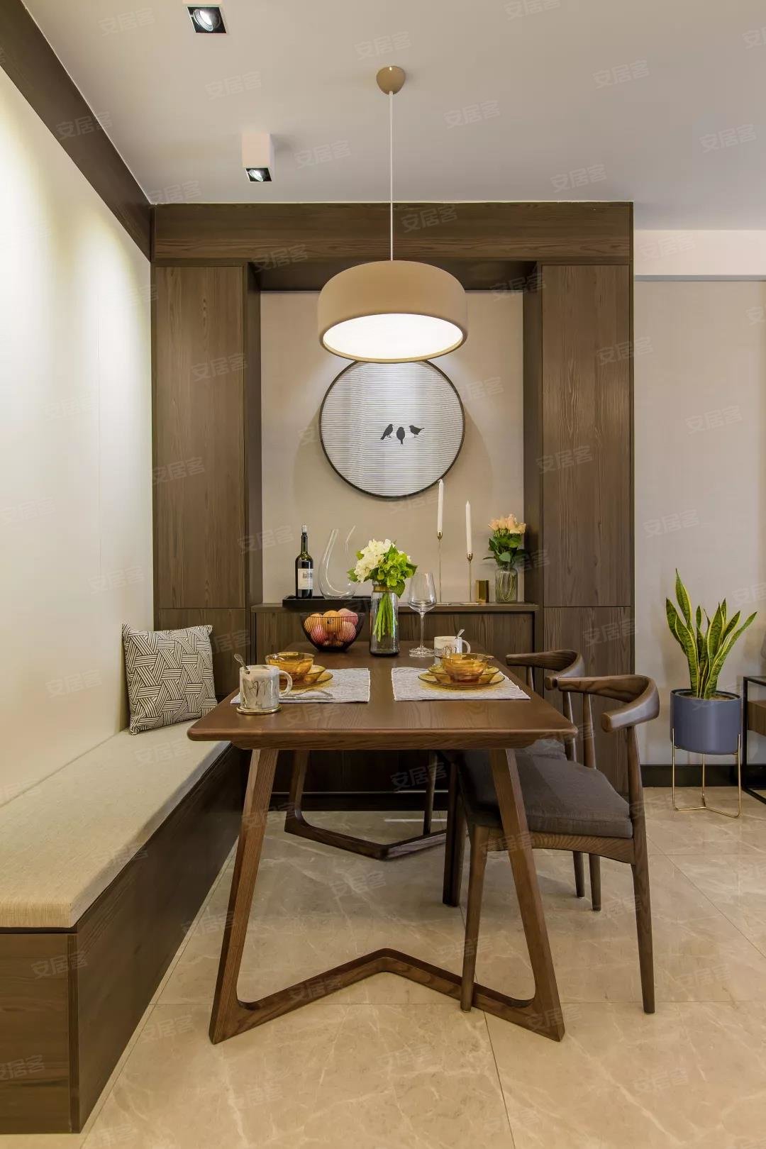鞋柜背后的是卡座式的餐厅,卡座侧方的墙面做上柜子和留空部分摆放挂画,复古的木质家具让餐厅空间看起来更有格调感。
