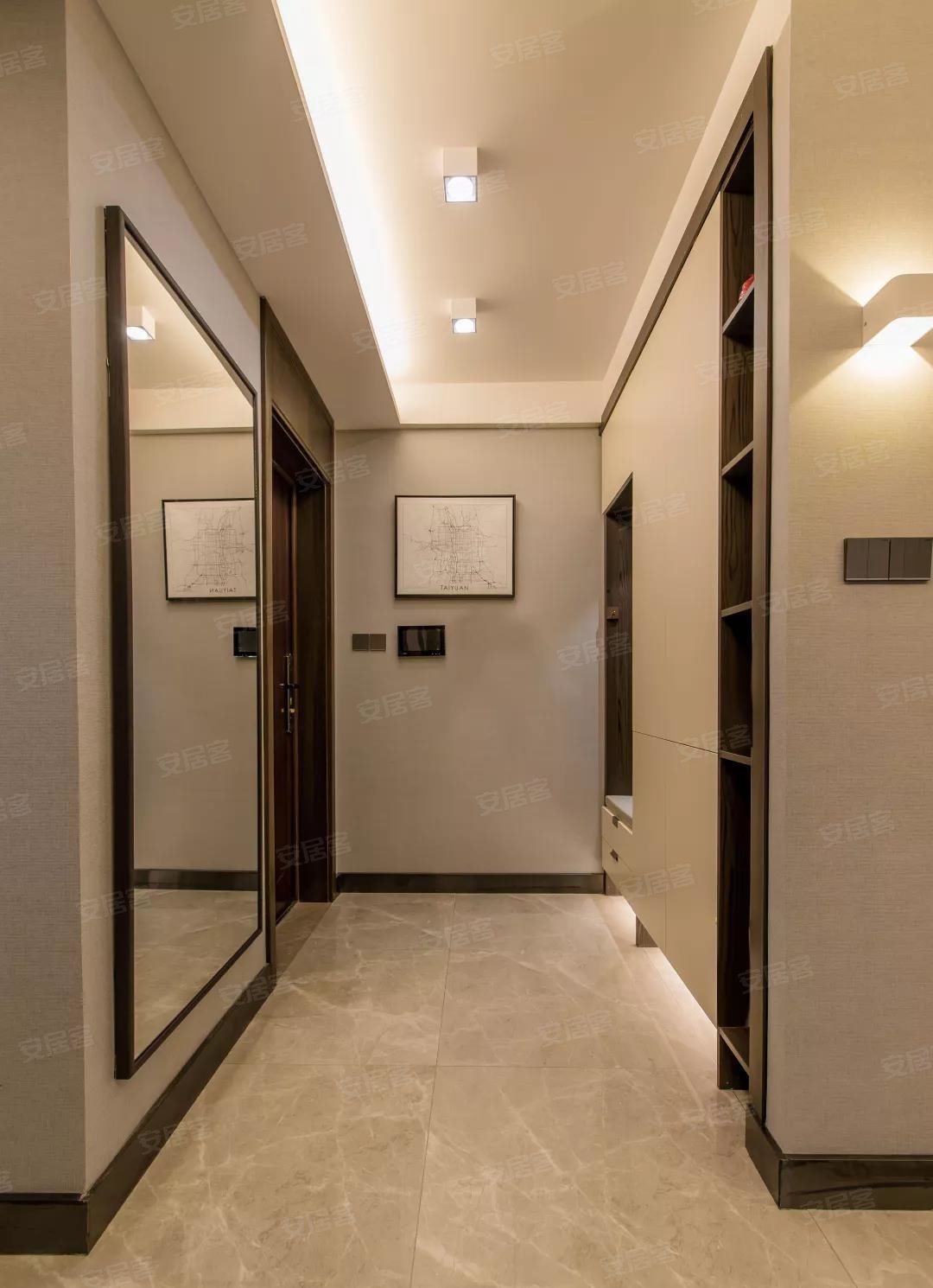 入户的玄关走廊处做上了到顶的鞋柜,鞋柜的底部留空加上藏光,在鞋柜当中还留了开放搁架和换鞋凳的区域,另一侧墙面摆放穿衣镜,平时使用非常方便。
