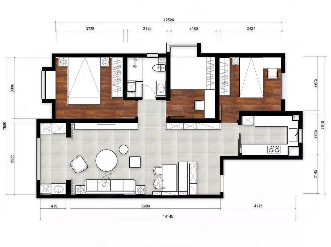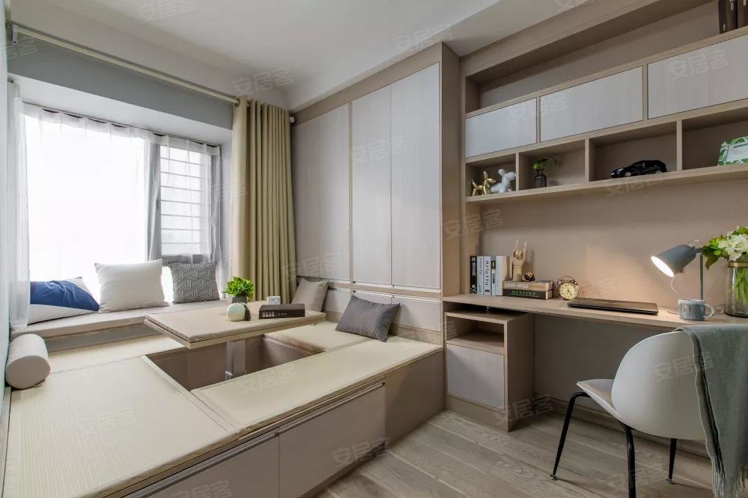 次卧是选择了做成榻榻米组合衣柜和书桌柜的设计,在榻榻米中间加入一个升降台,和朋友一起泡茶、玩游戏都会更为方便一些。