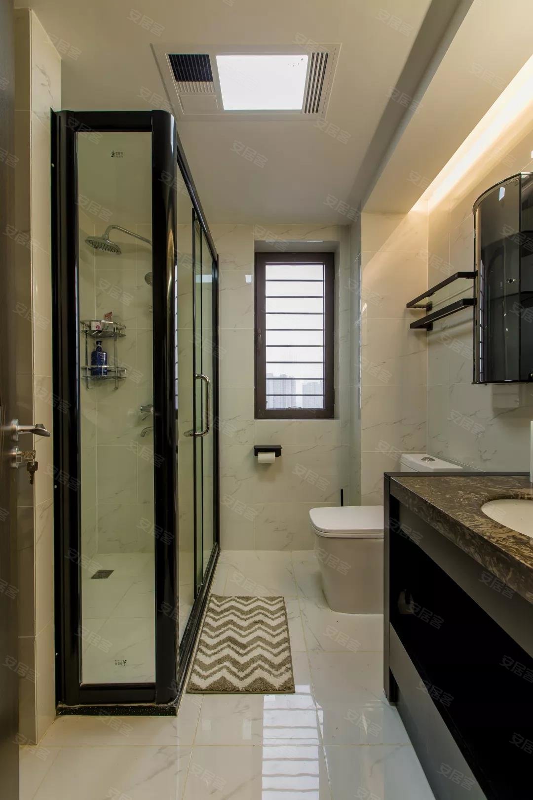 卫生间内部的空间比较宽敞,黑色边框的淋浴房加黑色的五金件,与浅色的墙地面刚好形成对比,整体变得更为耐看。