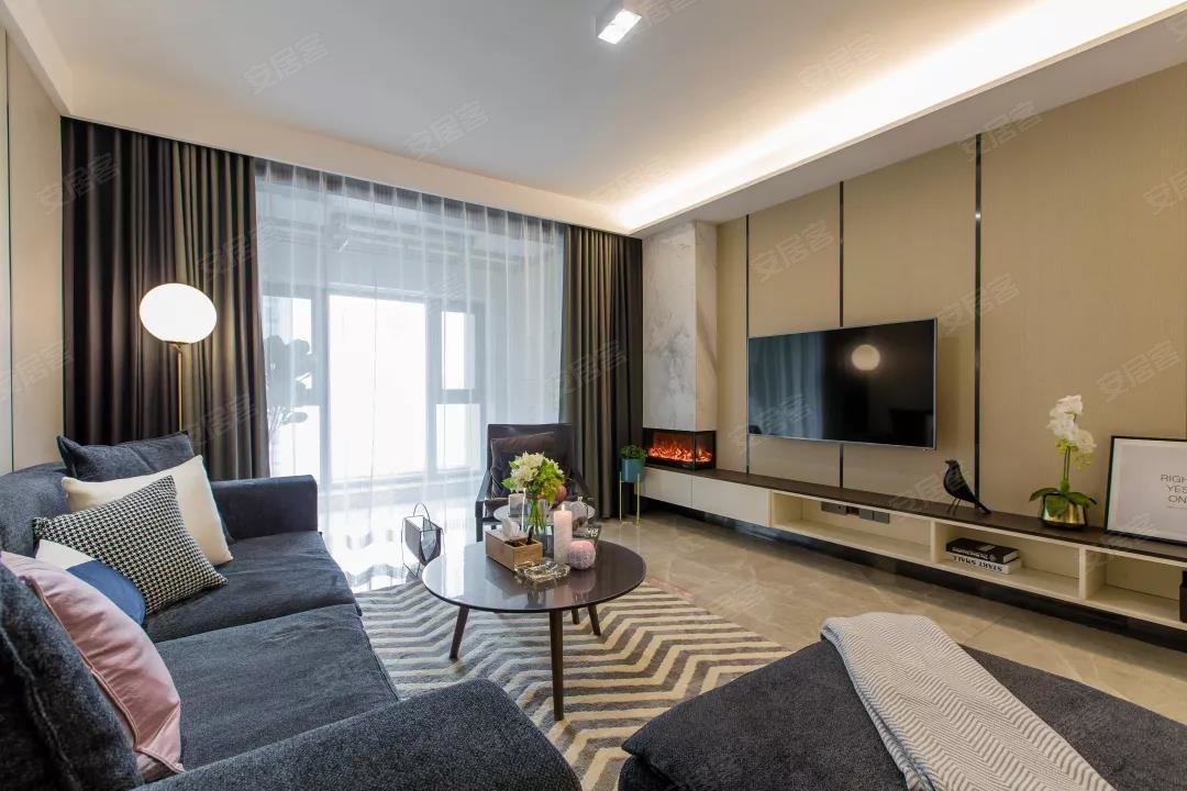 电视背景墙和沙发背景墙做了相同的设计,底部的电视柜选择悬空款式的,侧方还有个壁炉和大理石结合的造型,看着更为大气。