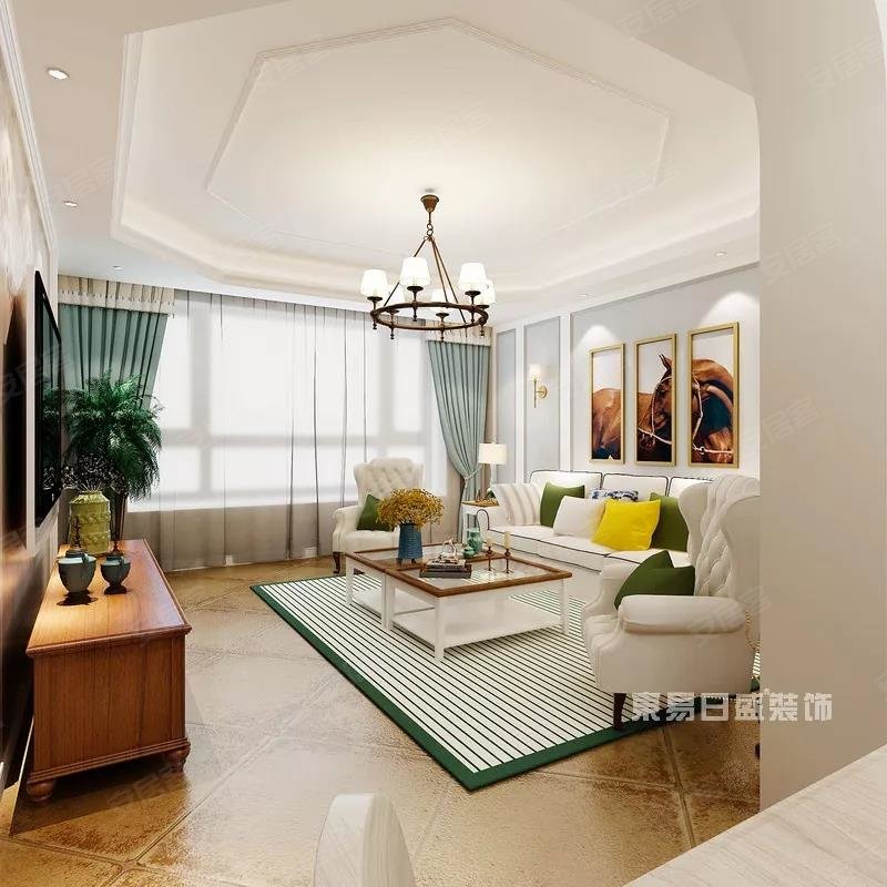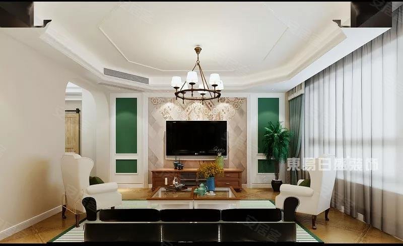 客厅墙面整体是浅黄色乳胶漆,简单的石膏线吊顶,沙发和电视背景墙有一些造型,都是很简单的美式风格造型。