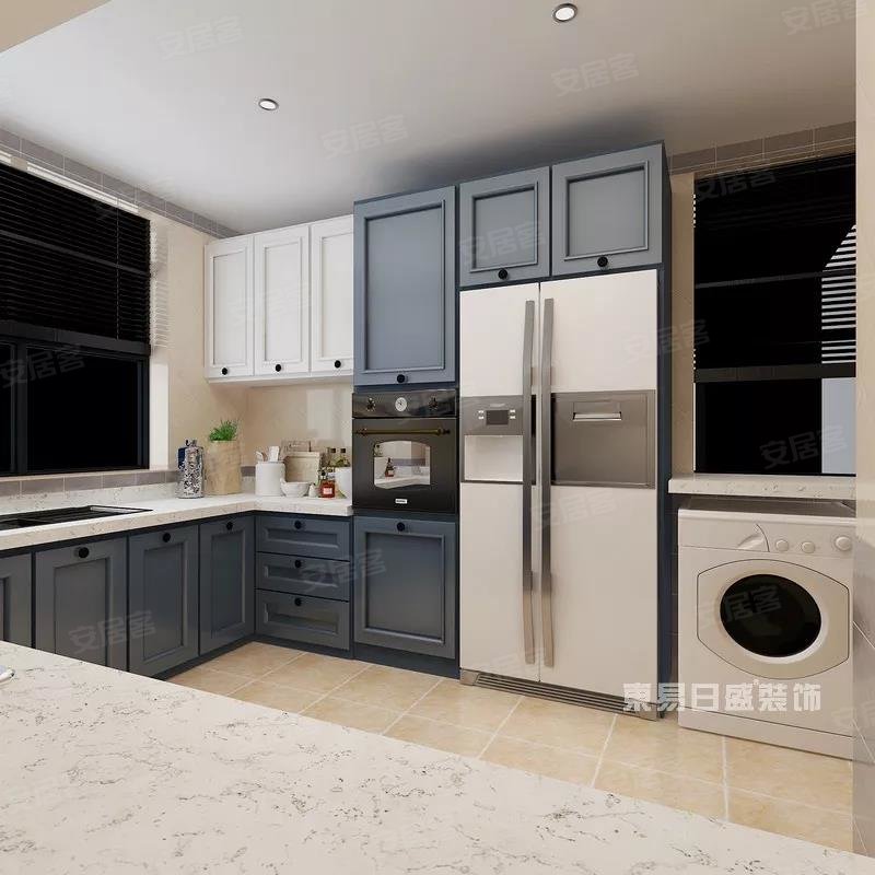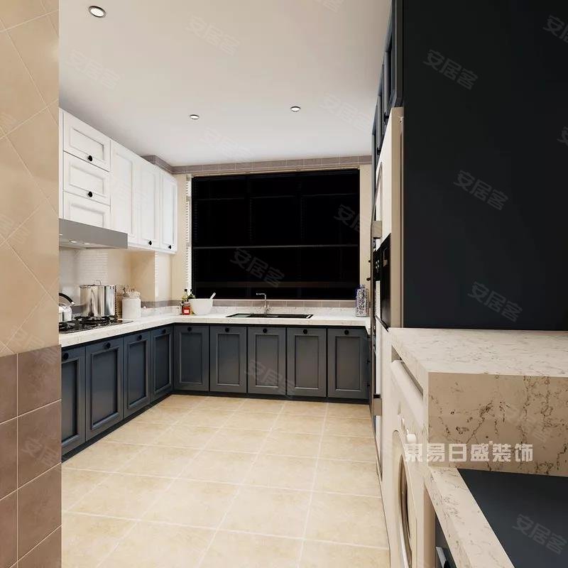 U型的厨房布局,最是人性化,深色的橱柜、浅黄色墙面砖、白色的操作台面,看起来干净而整洁。