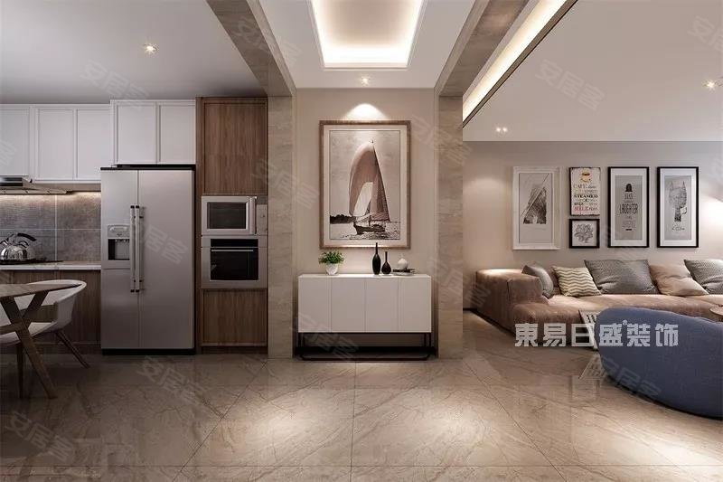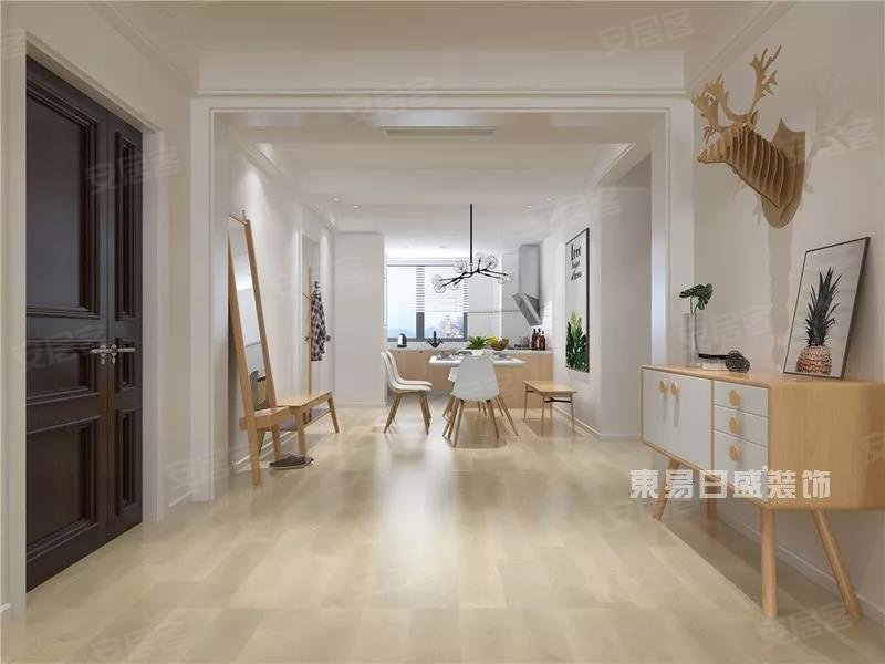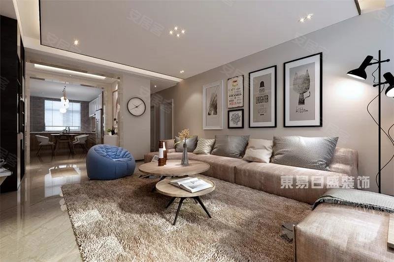 质感粗粝的地毯,极具质感的沙发,暖木色壁纸配合极简线条设计壁画赋予了居家简洁时尚的温暖气息,空间规划简明合理,增添了门厅设计,客餐厅之间以门洞相隔,整体空间层次更加丰富通透。