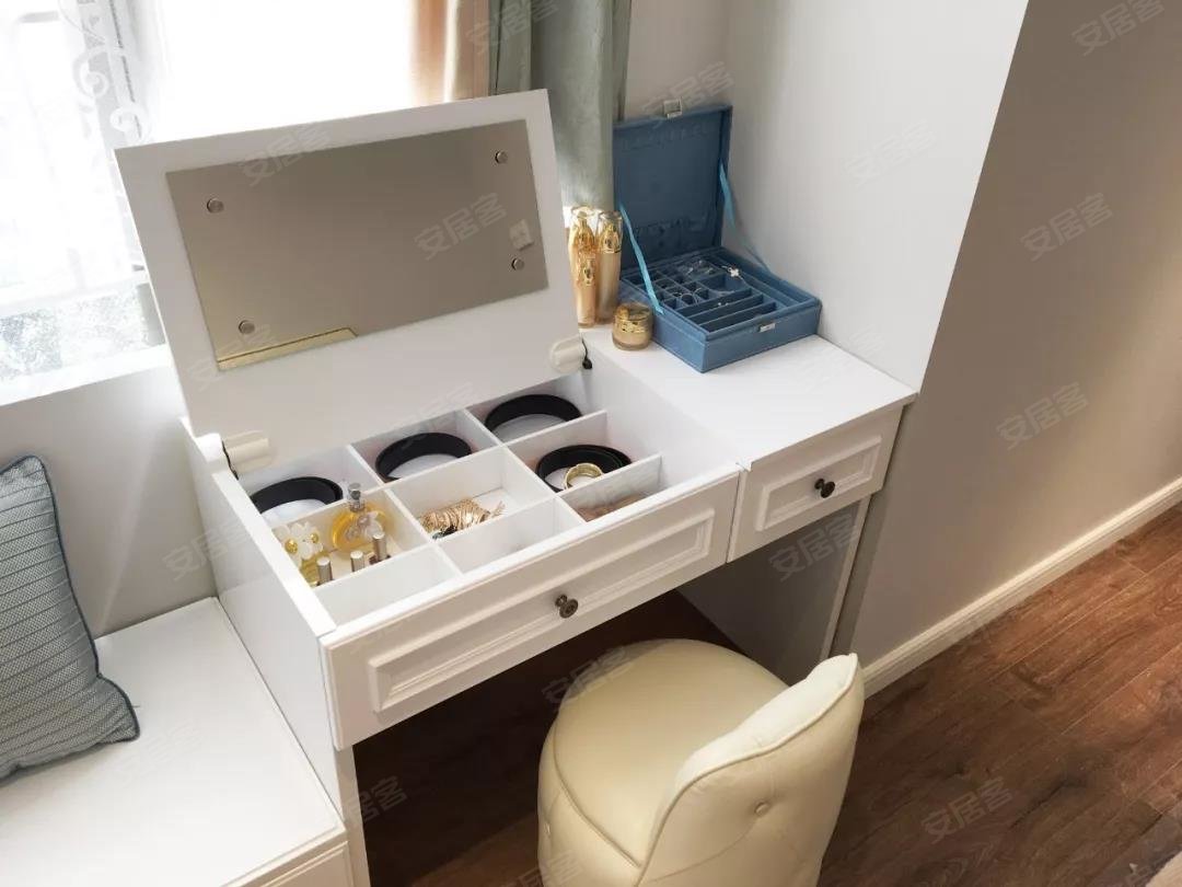 ▲翻盖式梳妆台,需要打扮时把桌板打开,镜子和化妆品就在里面,这种设计可以化解镜子对着床的尴尬,小饰品都分门别类收纳在抽屉里,一目了然随取随用。