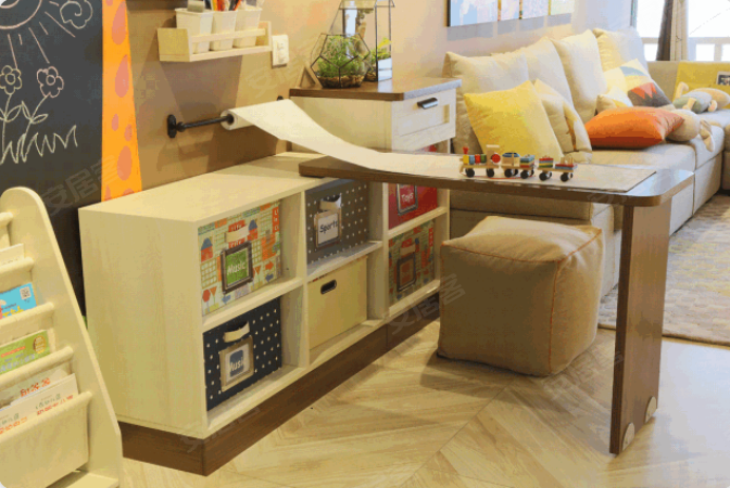 ▲家里腾不出陪伴孩子的空间那咋办?设计带旋转搭接台的储物柜就可以解决,能收纳不说,还可以成为孩子写写画画或者读书的桌子。如果孩子想玩游戏了,收起搭接台然后铺张地毯,就可以开始愉快的玩耍啦。