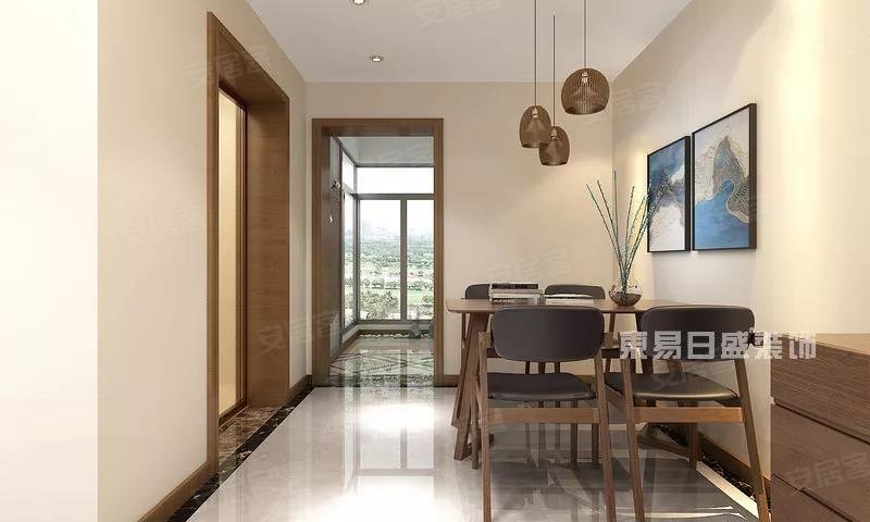 开放式餐厅选用原木风家具和现代感灯饰营造出宁静平和的用餐氛围,青山碧水主题的墙面挂画似应景而生,舒适感倍增。