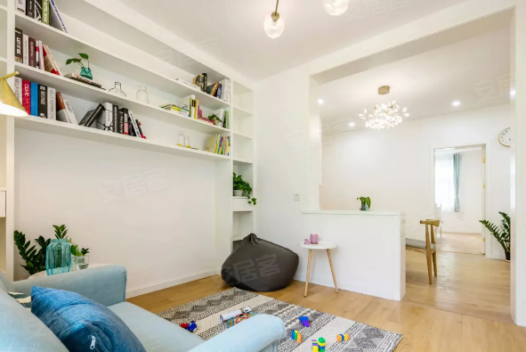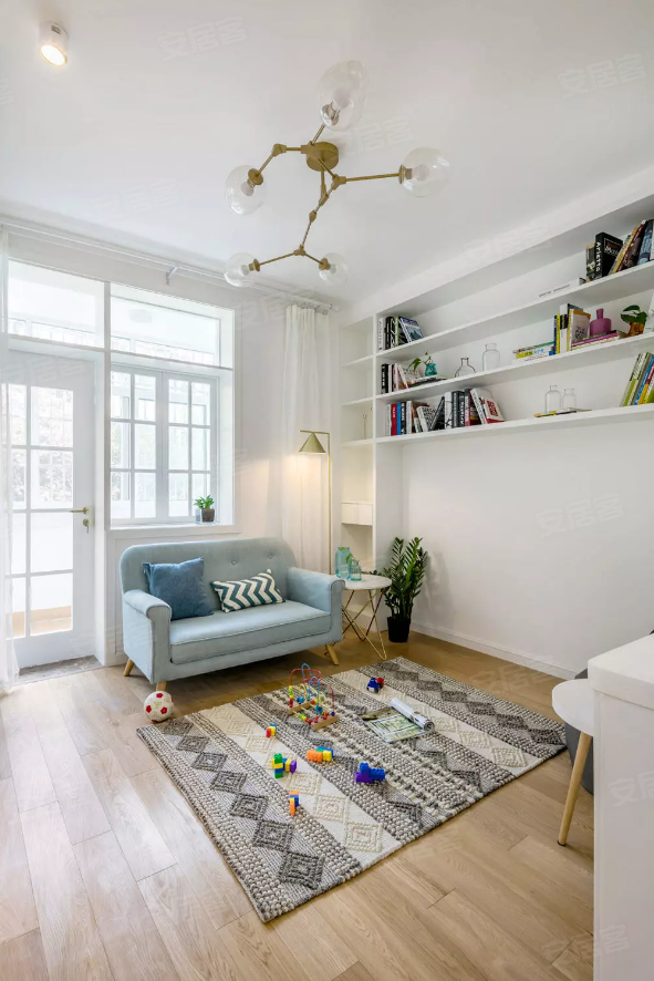 客厅是家庭的核心区域,更是宝宝将来的游玩场所,清新明亮的文艺白搭配原木色的木纹砖,定下了温馨明亮的空间基调,蓝色布艺沙发、柔软的印尼地毯,整排的书架下预留出的钢琴位置,让整个空间流露出简约的美感。