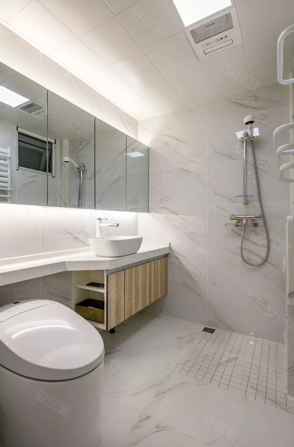 卫生间一整面的镜柜和台面,不仅在视觉上给人以扩大卫生间的感受,更最大化利用了空间。