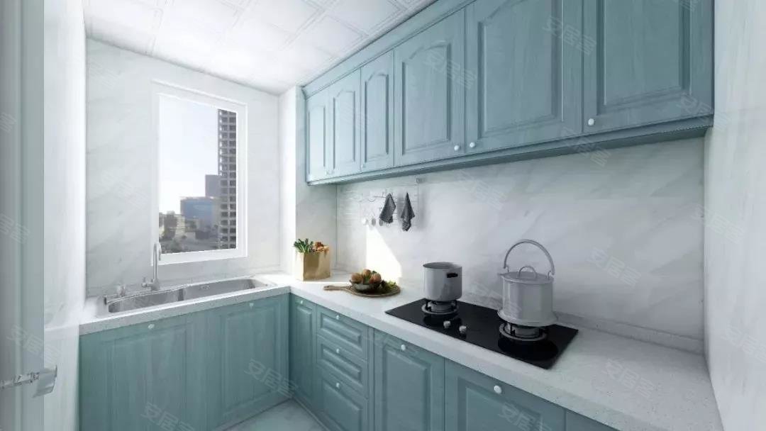 △ 岩青色橱柜给人一种优雅的感觉,搭配浅灰色墙地砖,整个空间显得舒适大气,带着淡淡的梦幻感。