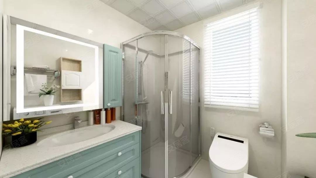 △ 和厨房的配色一样,卫生间的浴室柜也选用淡蓝色,搭配浅色的墙地砖,整个空间显得清爽、简洁。