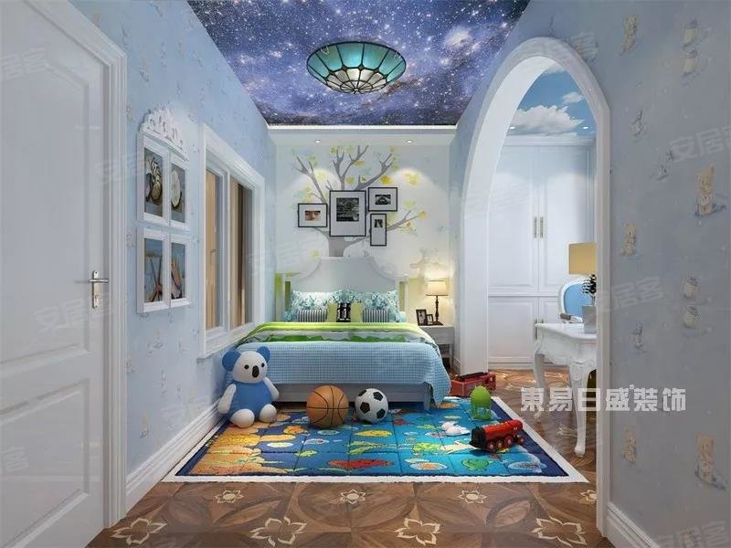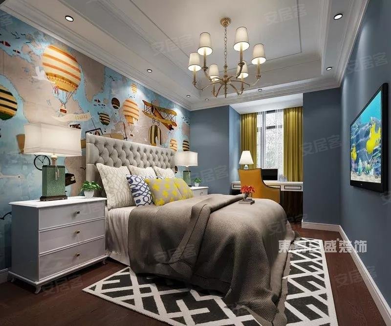 简欧式装修,深咖色的地板搭配令人安心的海军蓝墙壁,给孩子满满的安全感,热气球将带他环游世界,去海底和鱼群亲吻,去火山感受大自然的惊叹。