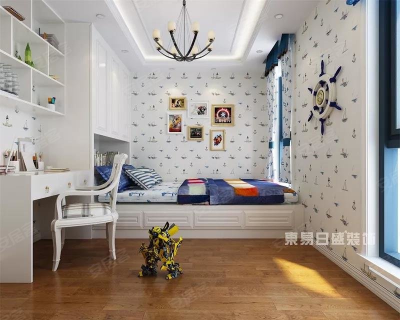 地中海式风情,明亮的白色与碧海蓝天连成一片,定制式床柜一体是孩子理想船舱,船舵、风帆尽在掌握,梦中隐隐能闻到海风的咸