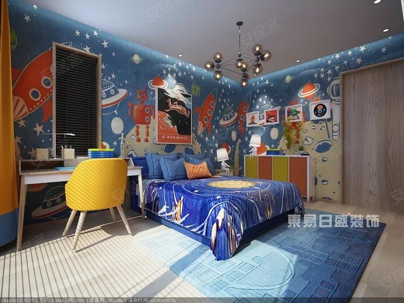 木质的底色、灰蓝格纹的地毯编织出梦想蓝图,充满飞船、ET、外星人的活泼壁纸,守护着孩子甜甜的梦。
