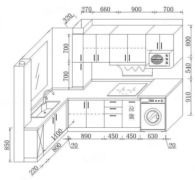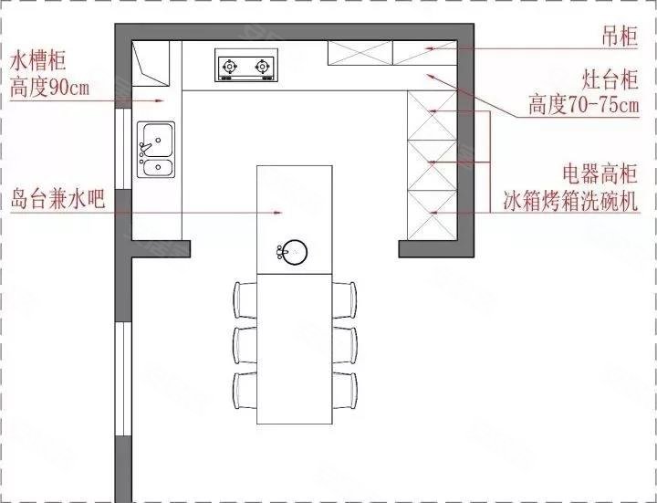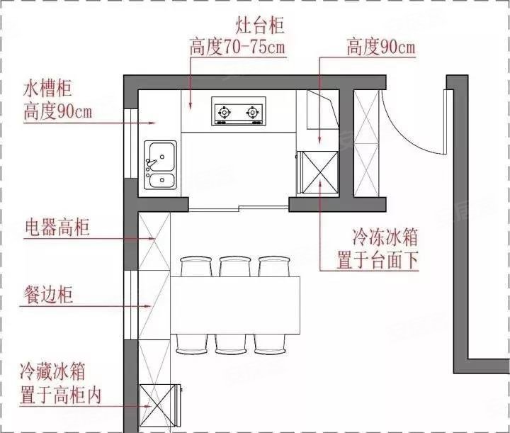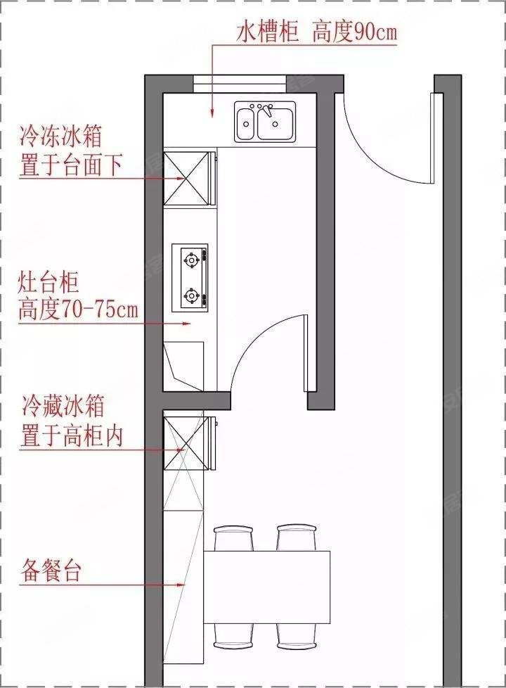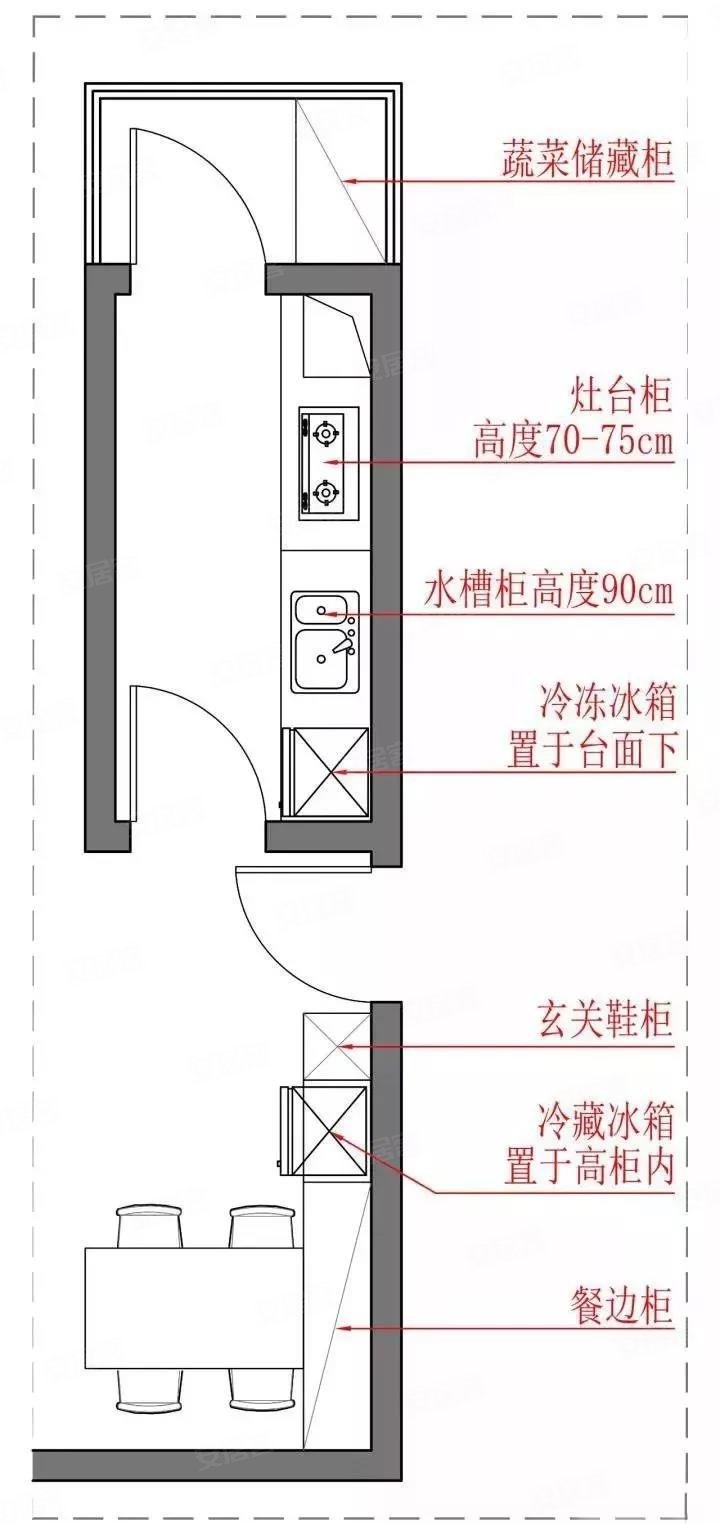 厨房有效长度至少2400mm能正常使用。参考设计尺寸如下: