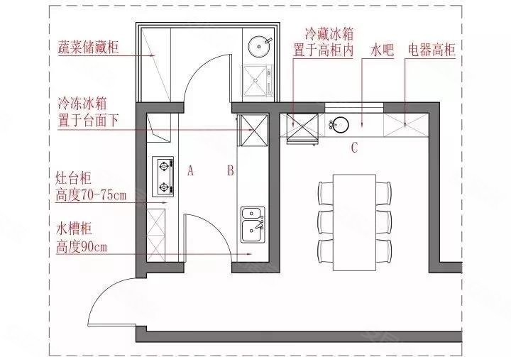 厨房+餐厅有3个收纳面,分别在图中以A、B、C三个面标记。不同墙面收纳可以参考以下布置。