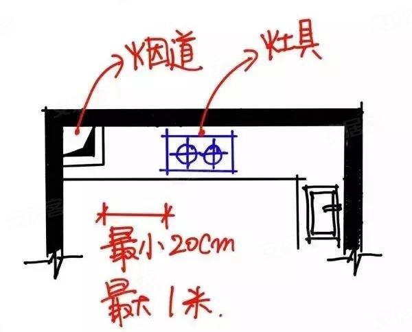 灶具和排烟口中间忌有梁,其一是排烟道的尺寸太大无法穿梁,绕梁就会多次转弯不仅影响排烟效果,还会损失吊顶高度(需要扩大吊顶尺寸容纳绕梁烟管)。