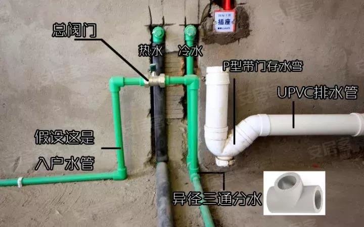 ❖如果进户水阀预留在厨房,用三通分出水槽和其他地方用水管道,热右冷间距200mm。也可以在此位置添加前置过滤器,保护家中用水设备。