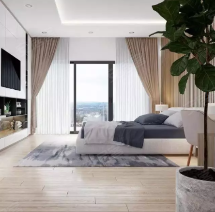 除了飘窗,带落地窗的卧室也具有非常强的吸引力,大面积的窗户,不仅提供大量的自然光,让卧室明亮透气,在视觉上也显得更加开阔大气,窗外的绿化景观也会为室内空间增添生机,人与自然和谐相融。