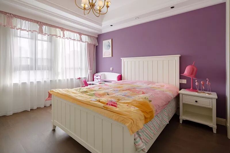 紫色背景墙、粉红色蝴蝶结窗幔窗帘,米白色美式床