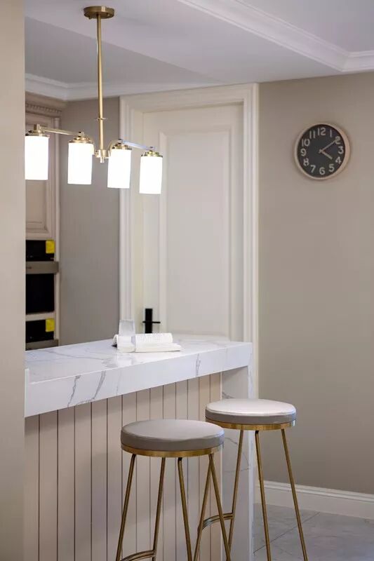 岩石台面,铜制绒面高脚凳,柔亮的灯光下