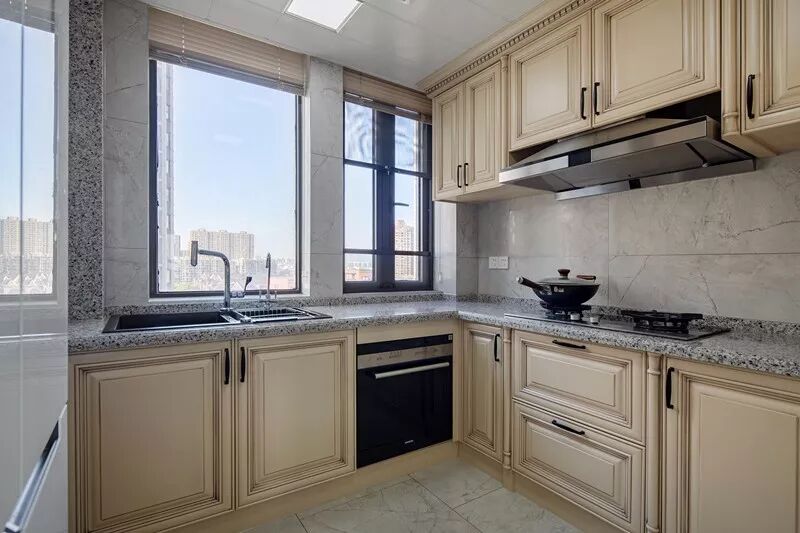 奶油色美式实木橱柜,方形套纹,凹凸感门板