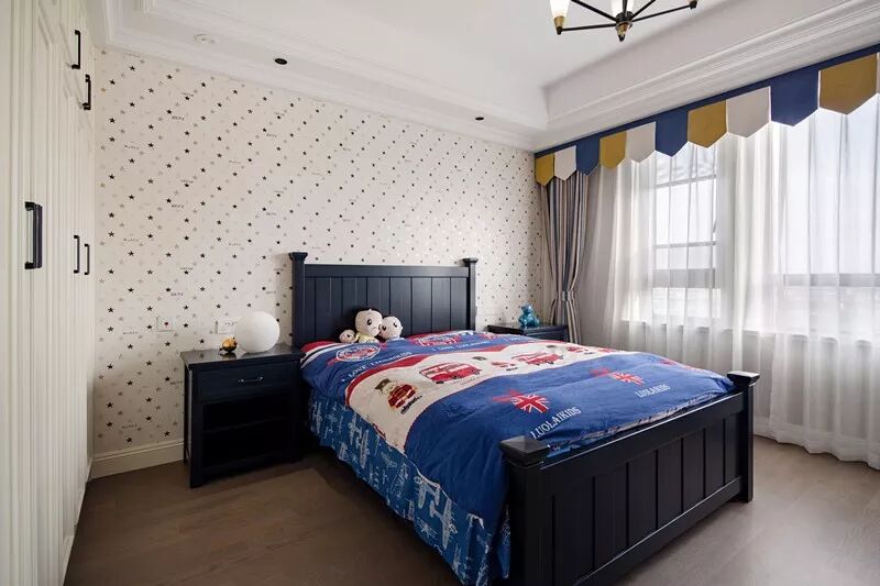 星星墙面、条形纹窗帘,搭配英伦风的窗幔及床品
