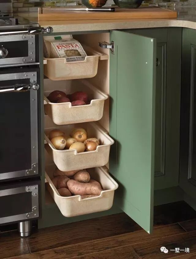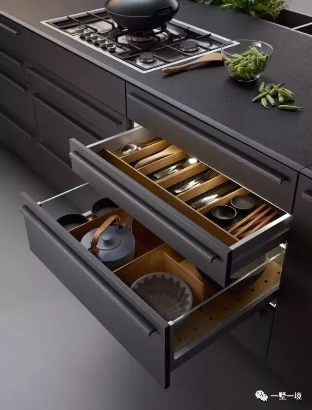 ②分设柜体、拉篮、抽屉根据厨房收藏功能的不同,橱柜设计要求分设柜体、拉篮、抽屉。其中拉蓝靠近灶台位置,存放做饭用的调料、刀、勺等,方便做饭时随时取用。电器类的产品可做高柜内嵌,如空间足够,可以设计岛台,增加厨房操作台面。