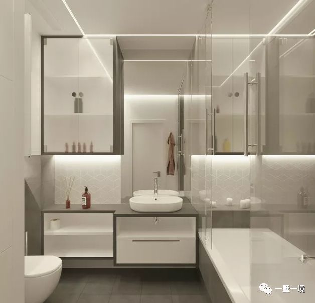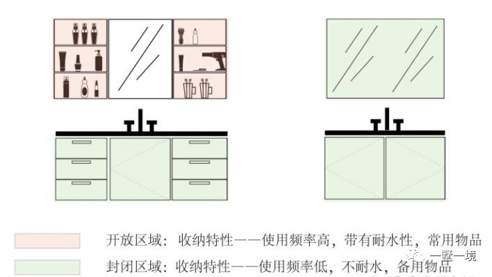 浴室柜收纳主体为水盆柜,传统成品的浴室柜收纳空间相对固定,可选用定制产品,设计抽屉等分类收纳。