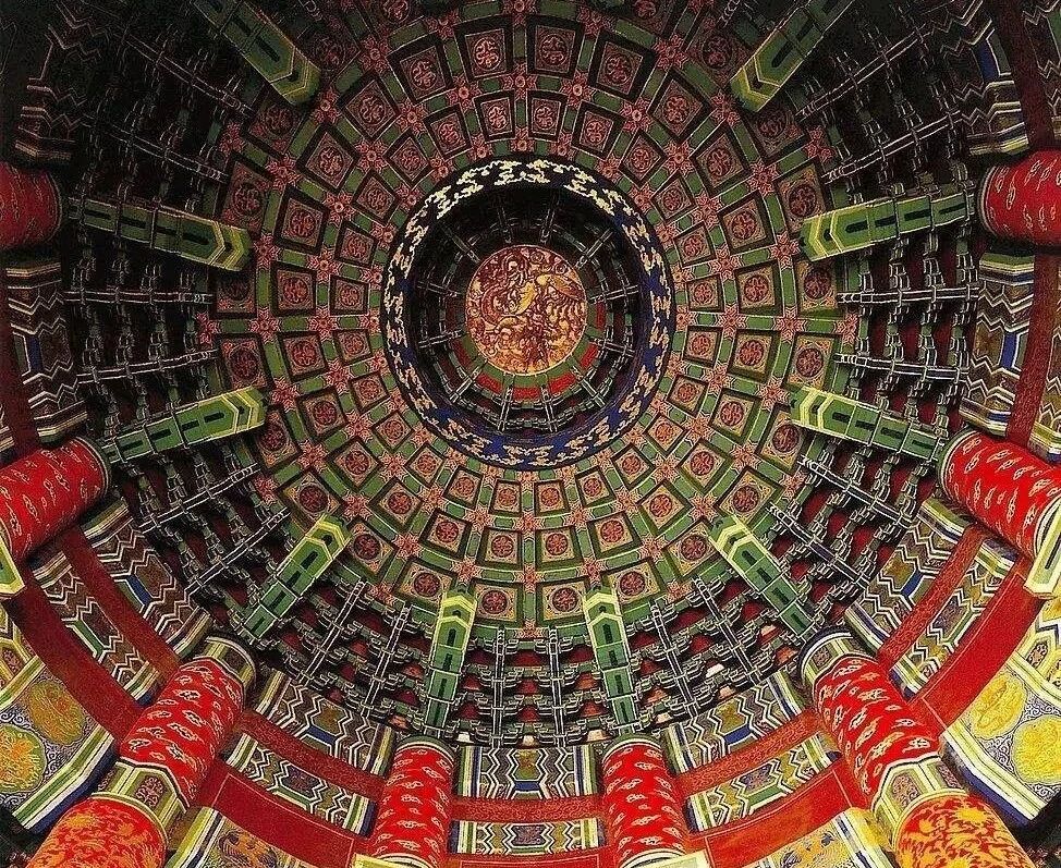 祈年殿28根大柱支撑檐顶,形成3层柱网,外围12根檐柱支撑下层檐,中层12根金柱支撑第二层檐,中间4根钻金柱支撑上层檐,这28根柱子由60根横梁和弯梁连成一个整体,梁上架柱,柱上架梁,殿内斗拱和牟榫层层支架,层层收缩,形成内部的穹隆圆顶。