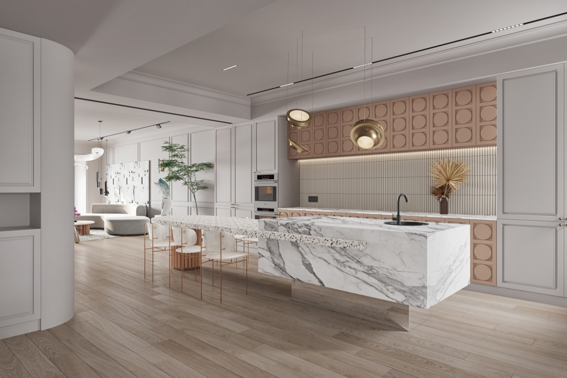 餐厅采用的是后现代的风格,用大面积的雾隐灰辅之以古巴砂色,给人一种舒适的开阔感;金色的装饰点亮空间,体现出轻奢气质。