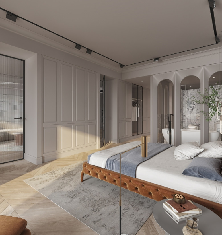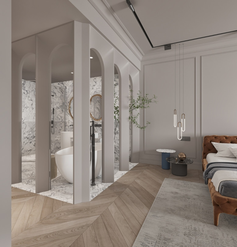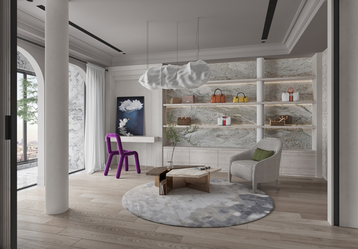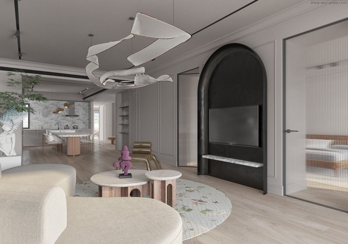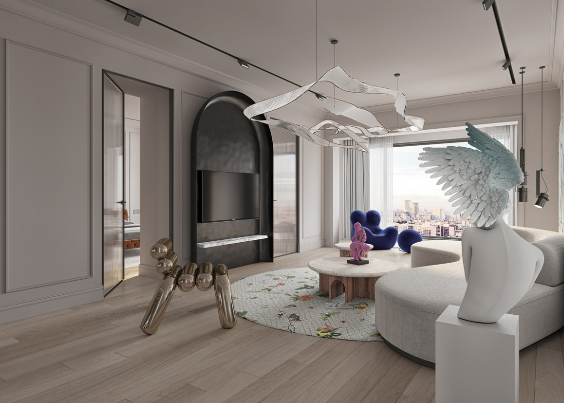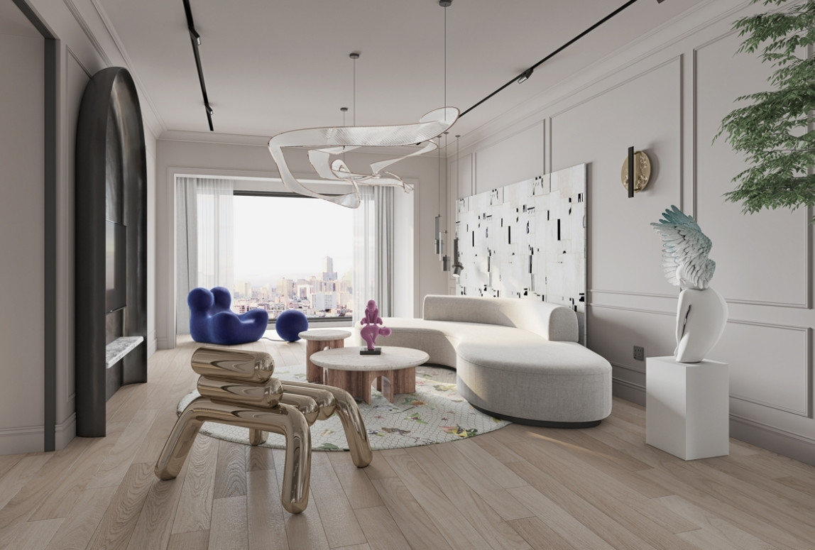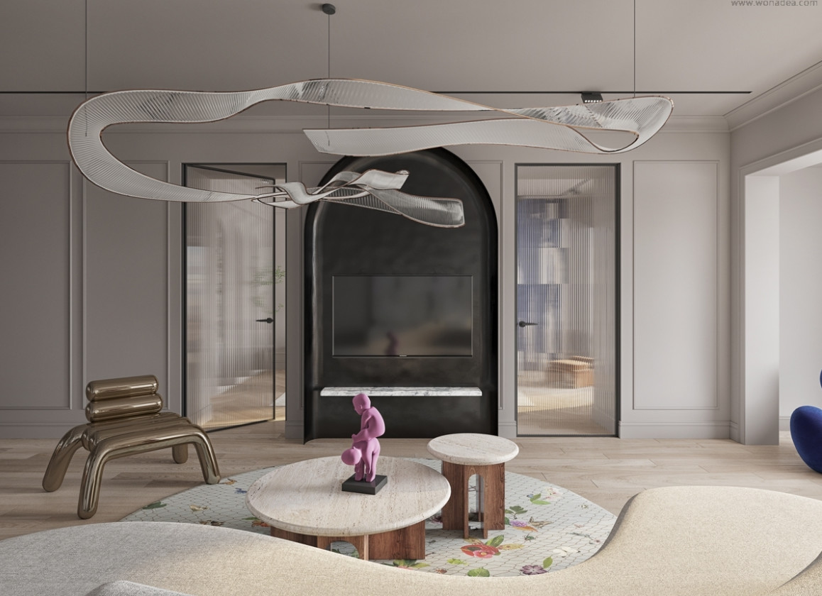 考虑到王逗逗本人时尚前卫的特质,从中抓取了关键元素,将美式轻奢风格融入到更时尚的现代手法中,改变以往常见的对称结构,使得整个设计更加均衡和前卫。