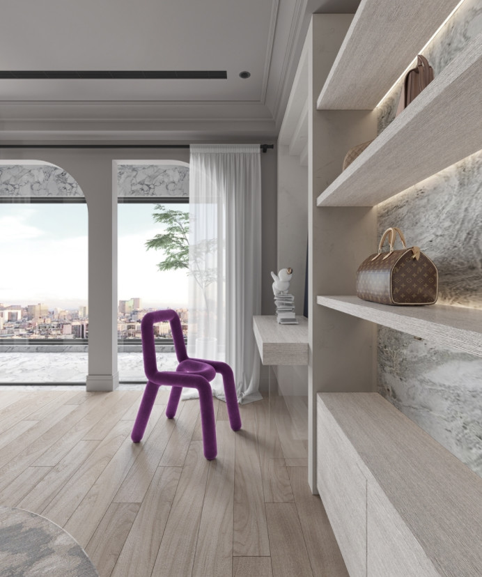 书房中的圆柱、几何造型、门洞都沿用了建筑形式,加入雾隐灰+古巴砂色的色彩调和,打造出典雅清灵的气质。而绛紫色的加入让空间更加魅惑诱人,充满女孩子最爱的神秘感。