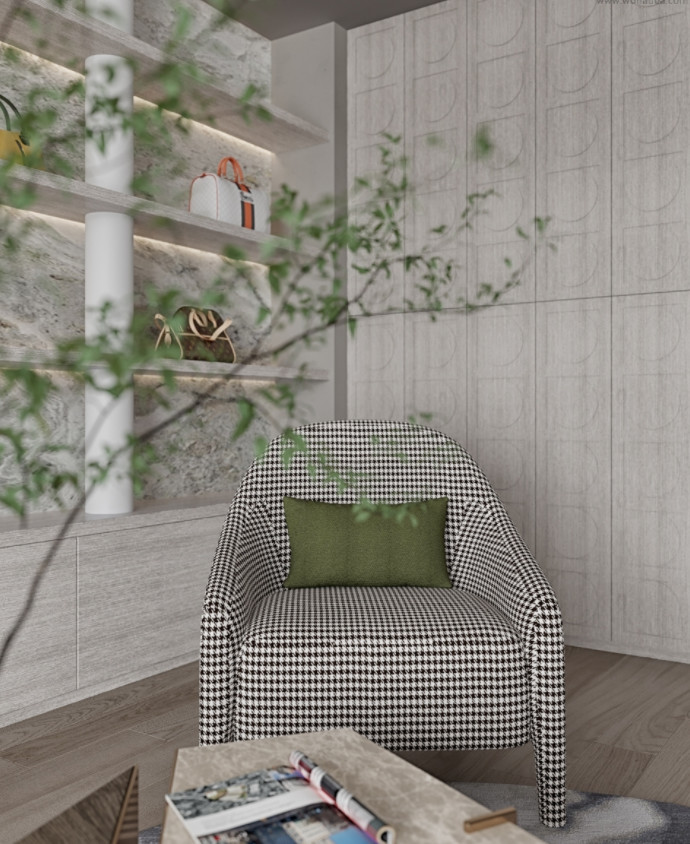 许多设计的角落都是精心打磨,来对应“不一样的时尚”。比如说电视背景墙像岩洞的质感: