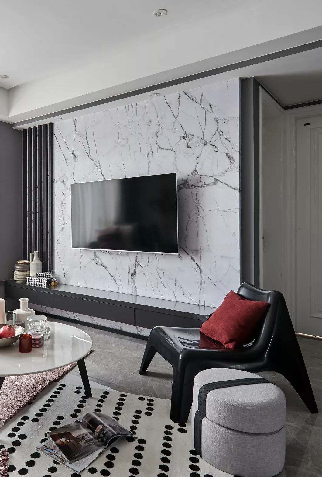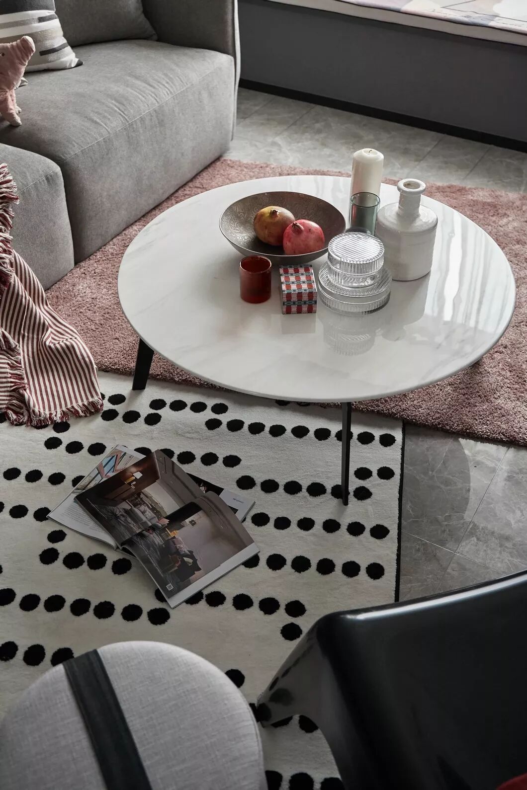黑色波点地毯活跃了空间氛围,以轻松、活泼的图案增强视觉感染力,让这一区域变得颇有趣味。