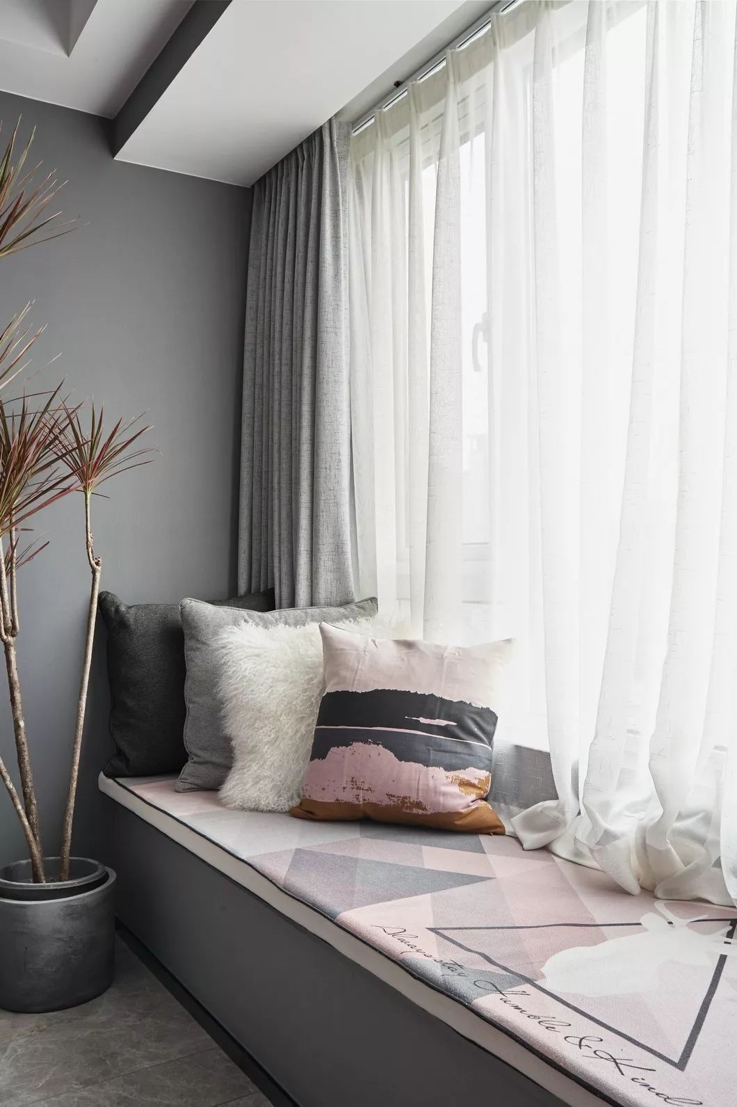 就连飘窗处的坐垫和抱枕,也延续了自带滤镜的灰粉基调,于不经意间演绎着优雅的极致魅力。