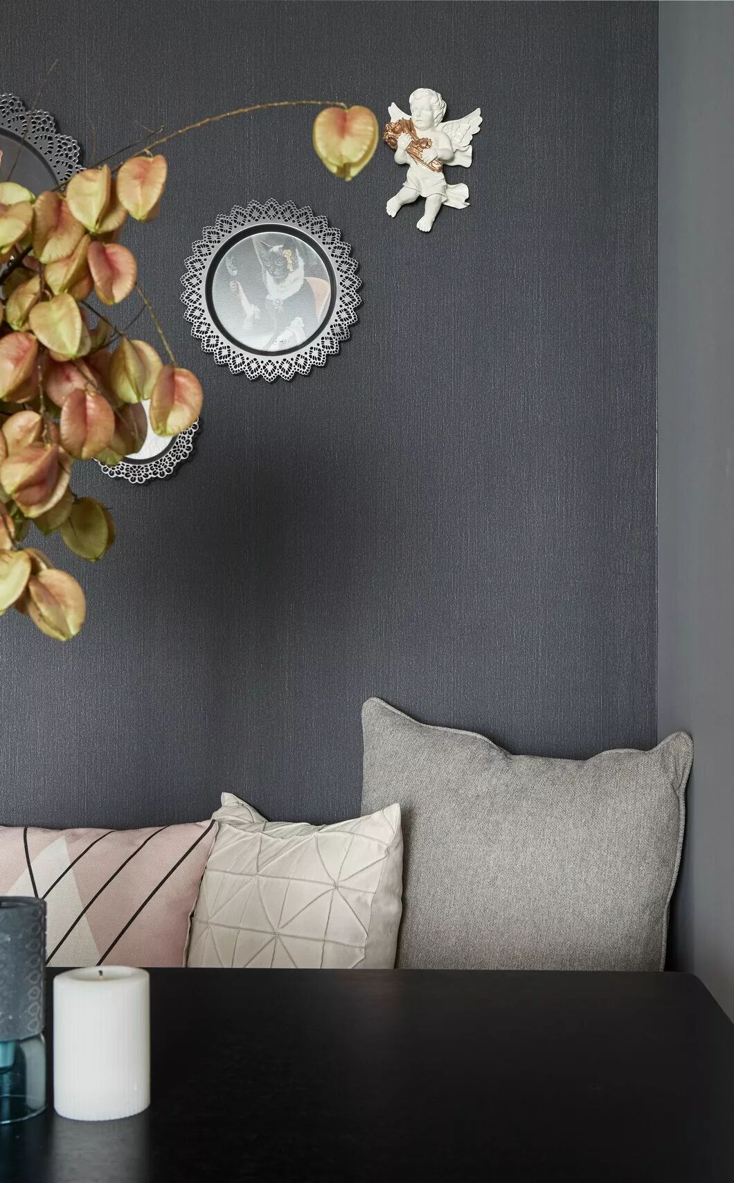 餐厅墙面装成灰色调的,给人以沉稳、静谧之感。然后搭配别致的复古挂盘去调和,餐桌上摆放精致的花束与餐具,令画面看起来更有层次感。