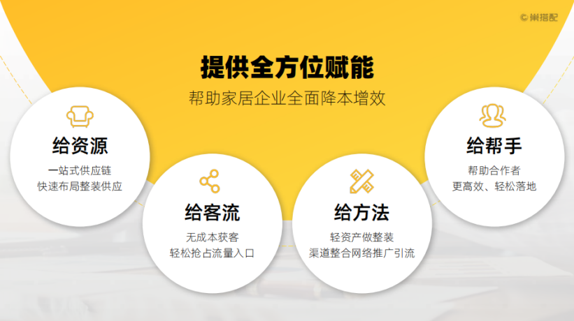 事实上,仅仅自己整合软装供应链,大多数装企难以企及,更不用说提供软装全案设计及落地服务了。 在这种情况下,赋能型平台是装企更为实用的一个选项:借助外力,应对成本增加不多却能提升运营效率,改善经营状况,突破困境。